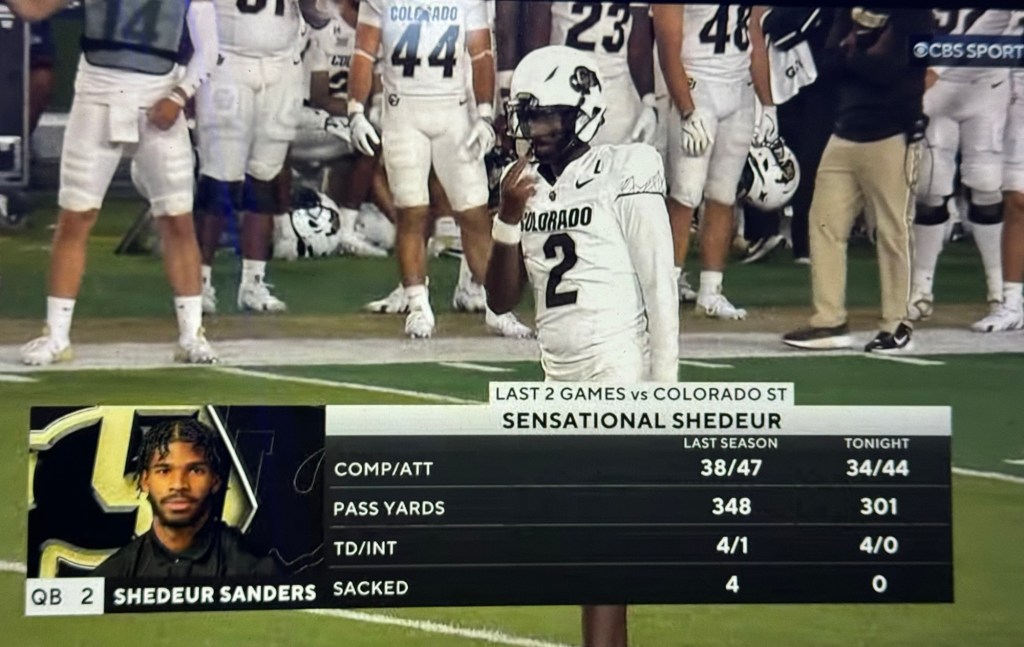 Colorado State finally made the final fatal mistake and fumbled a snap, making their 4th turnover of the game. They gave the ball back to Colorado with a chance to milk the clock and finish off a dominating win. Shedeur decided to come out throwing the ball, and adding to his already impressive stat line.